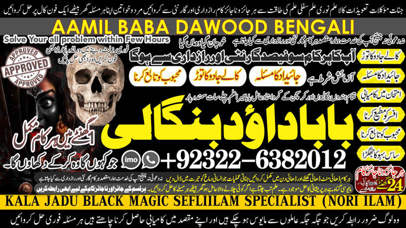 Amil Baba Dawood Bangali { PAK: 0322-6382012 ---- UAN: 0092-322-6382012} is a renowned spiritual healer and master of ancient occult sciences, specializing in Black Magic, Sephi Ilam, Nori Ilam, and Voodoo Spells. With decades of experience in the mystical arts, he has gained a reputation as a powerful and trusted guide for those seeking solutions to life's most challenging problems.