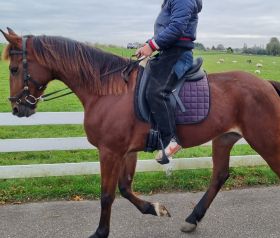Zeer lieve en mooie draver merrie zoekt een fijne plek. Ze is 154 hoog en 6 jaar oud. Netjes en braaf gereden in alle drie de gangen. Gaat graag mee op buitenrit en is heel goed verkeersmak, bomproef. Loopt gemakkelijk nageeflijk en maakt een mooie sprong. Lekker voorwaarts paardje maar makkelijk terug te rijden. Is zowel met bit als bitloos gereden. Veel uithoudingsvermogen en werklust. Heel braaf in de omgang en sociaal in de groep. Alleen voor goede plek bij iemand die lekker met haar gaat genieten.