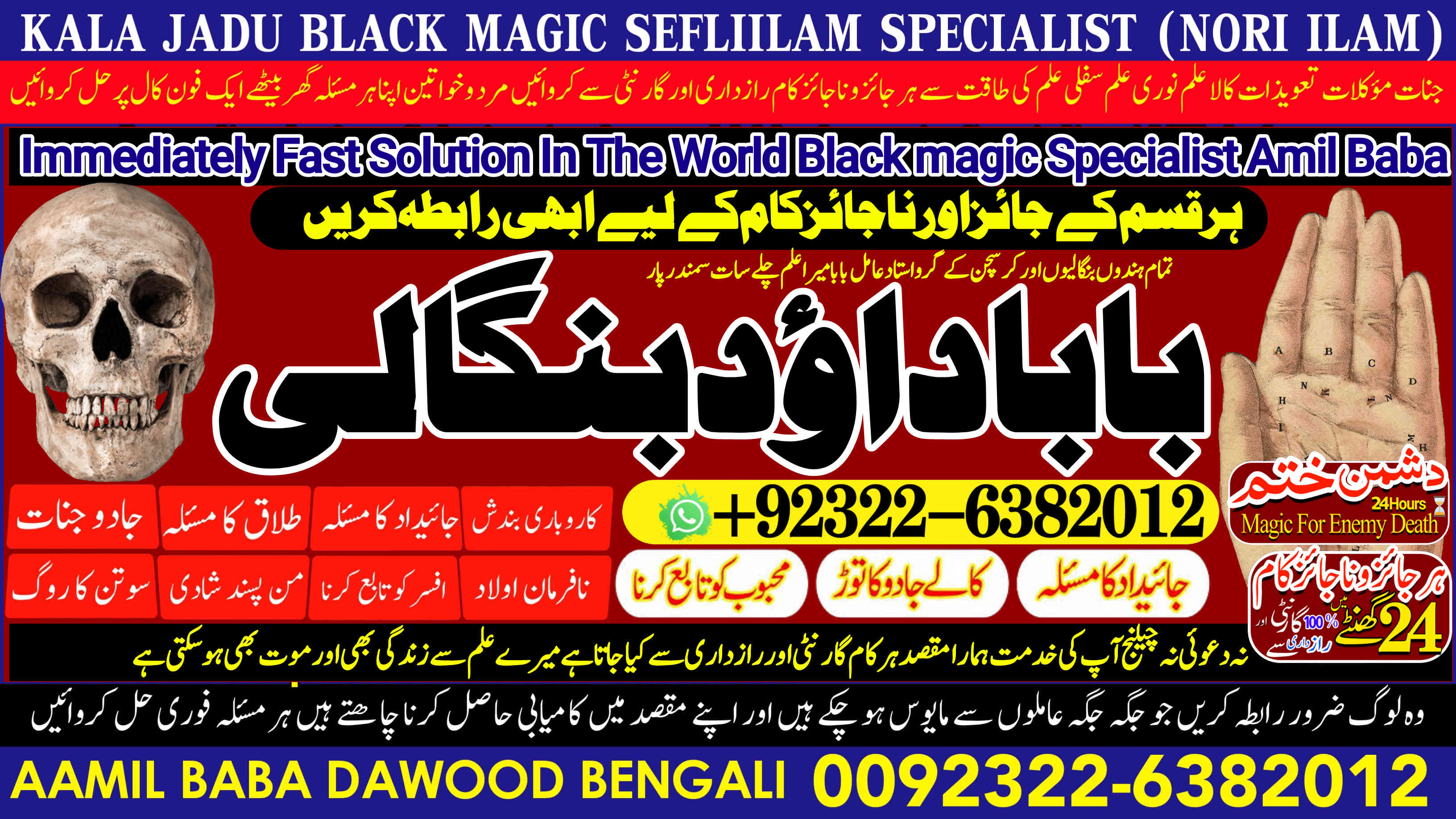 Amil Baba Dawood Bangali { PAK: 0322-6382012 ---- UAN: 0092-322-6382012} is a renowned spiritual healer and master of ancient occult sciences, specializing in Black Magic, Sephi Ilam, Nori Ilam, and Voodoo Spells. With decades of experience in the mystical arts, he has gained a reputation as a powerful and trusted guide for those seeking solutions to life's most challenging problems.