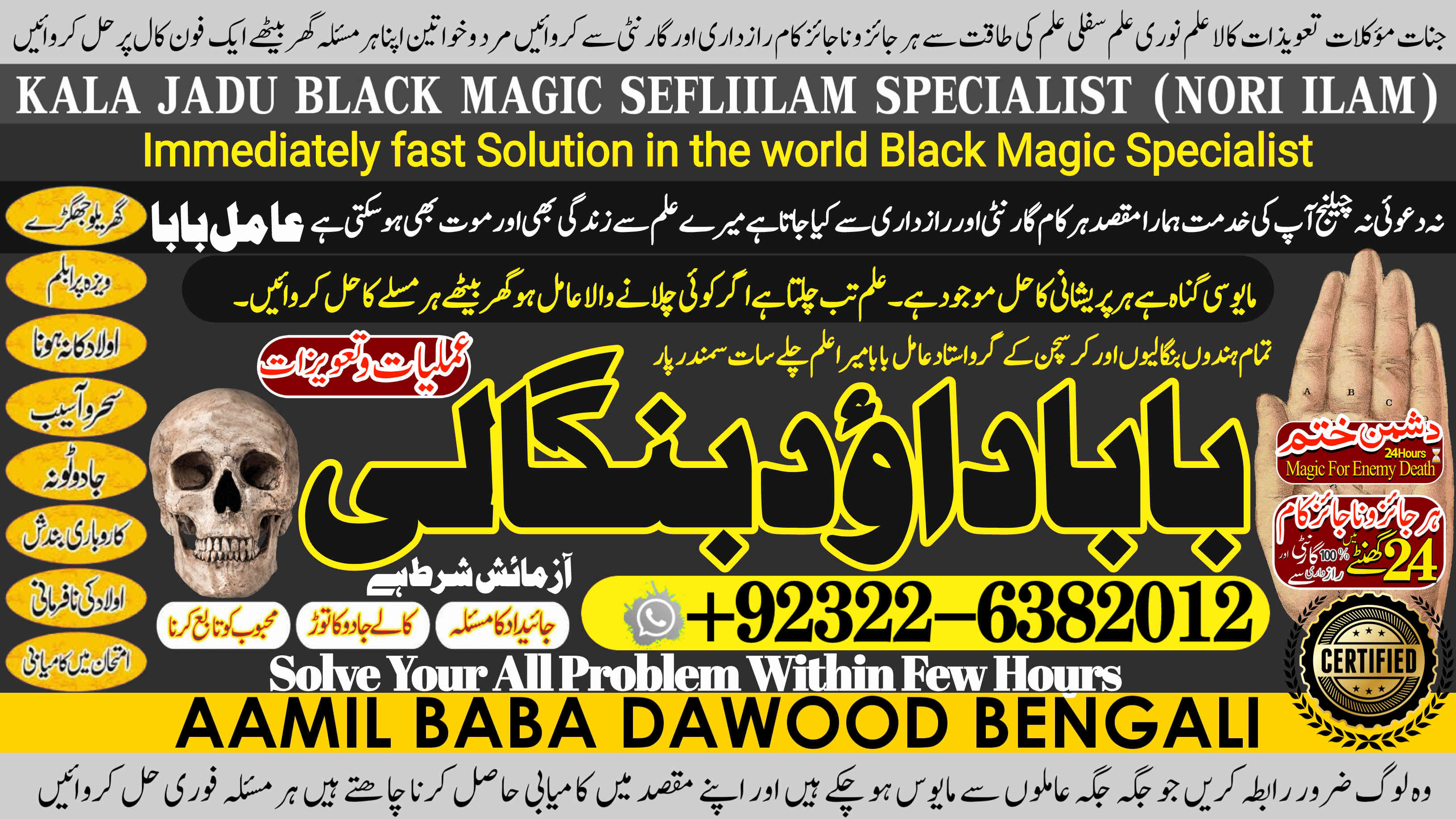 Amil Baba Dawood Bangali { PAK: 0322-6382012 ---- UAN: 0092-322-6382012} is a renowned spiritual healer and master of ancient occult sciences, specializing in Black Magic, Sephi Ilam, Nori Ilam, and Voodoo Spells. With decades of experience in the mystical arts, he has gained a reputation as a powerful and trusted guide for those seeking solutions to life's most challenging problems.